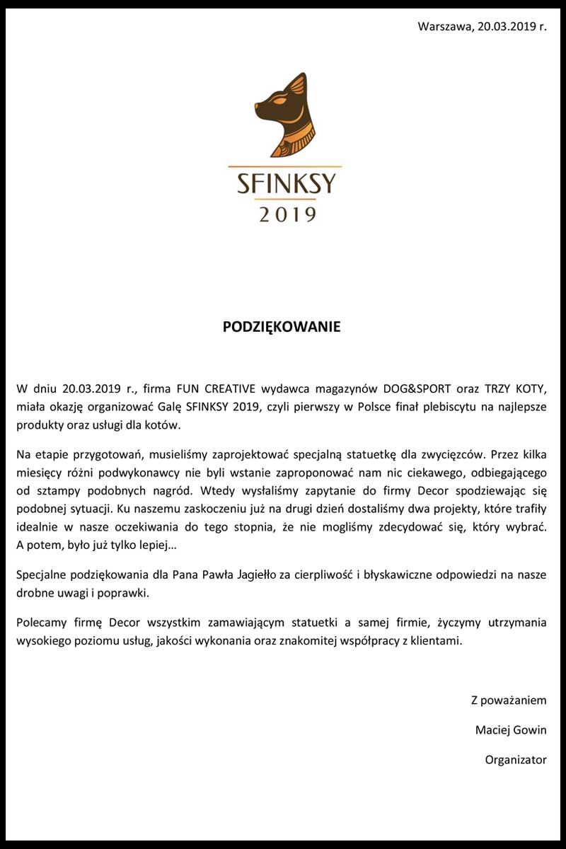 W marcu 2019 r. wraz z panią Niną Gowin (magazyn TRZY KOTY) i panem Maciejem Gowin (magazyn DOG&SPORT ) rozpoczęliśmy projekt przygotowania statuetek na plebiscyt SFINKSY 2019 .